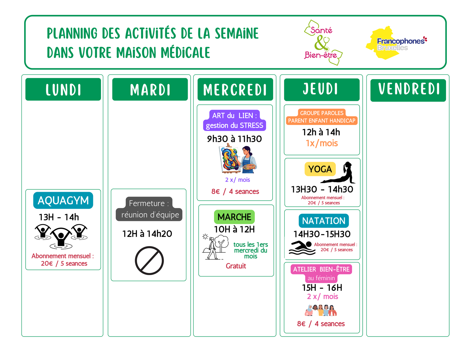 Les activités se font en fonction des besoins de notre patientèle, toutes les idées sont les bienvenues et cela se fera en fonction des critères de faisabilités (personnel disponible, salle, nombre de participants)